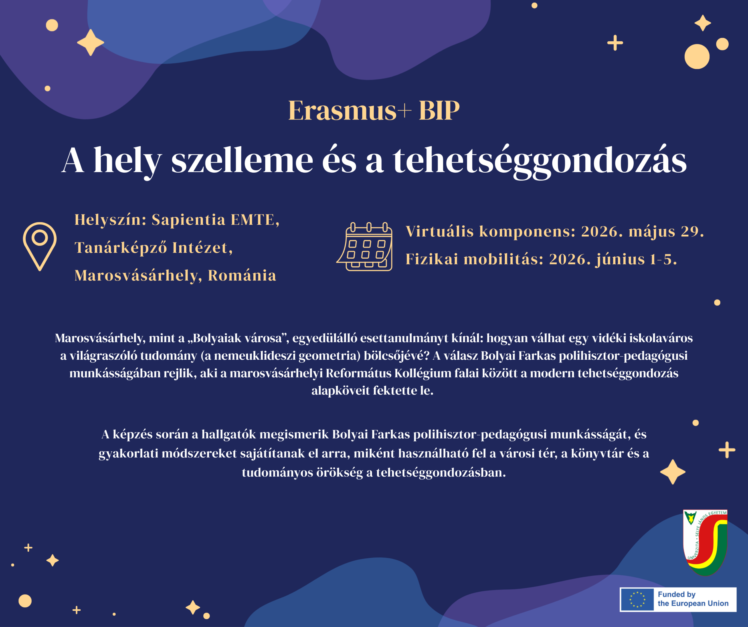 A Selye János Egyetem pályázatot hirdet meg az ERASMUS+ projekt keretében „A hely szelleme és a tehetséggondozás“ megnevezésű Blended Intensive Programme-ban (BIP) való részvételre.
